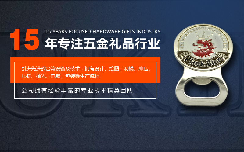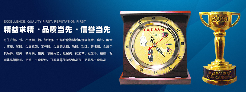 关于我们深圳市伟鑫隆五金饰品有限公司位于广东省深圳市坑梓镇,是一家集设计、生产、销售为一体的专业五金礼品工艺公司。 公司拥有经验丰富的专业技术精英团队,至今已有十多年设计生产经验。 公司自有工厂引进先进的台湾设备及技术,拥有设计、绘图、制模、冲压、压铸、抛光、电镀、包装等生产流程,可生产铜、铁、不锈钢、铝、锌合金、铅锡合金等材质的金属徽章、胸针、胸章、奖章、奖牌、金属标牌、工号牌、金属钥匙扣、狗牌、军牌、开瓶器、金属手机吊饰、钱夹、领带夹、帽夹、项链吊坠、挂包钩、纪念章、纪念币、袖扣、促销礼品钥匙扣、书签、五金配件、开瓶器等旅游纪念品及工艺礼品五金饰品。我公司还可根据客户样板开模生产。 公司秉承“精益求精、品质第一、信誉第一”的经营理念竭诚为广大客户服务。如贵司对我司产品感兴趣请与我们联系!我们会为您设计构造最理想的广告礼品、促销礼品、商务礼品!